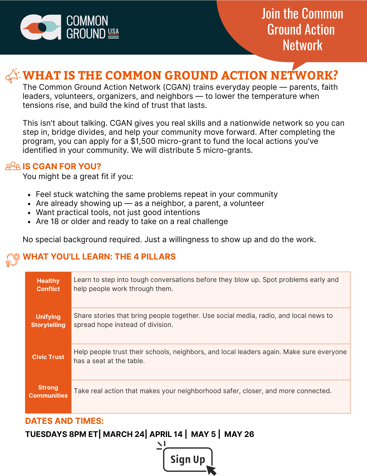 The Common Ground Action Network (CGAN) gives everyday people the tools to handle conflict, build trust in our communities, and connect our neighbors even when they disagree. Together, we’re strengthening communities to help us create an America where we all thrive.
